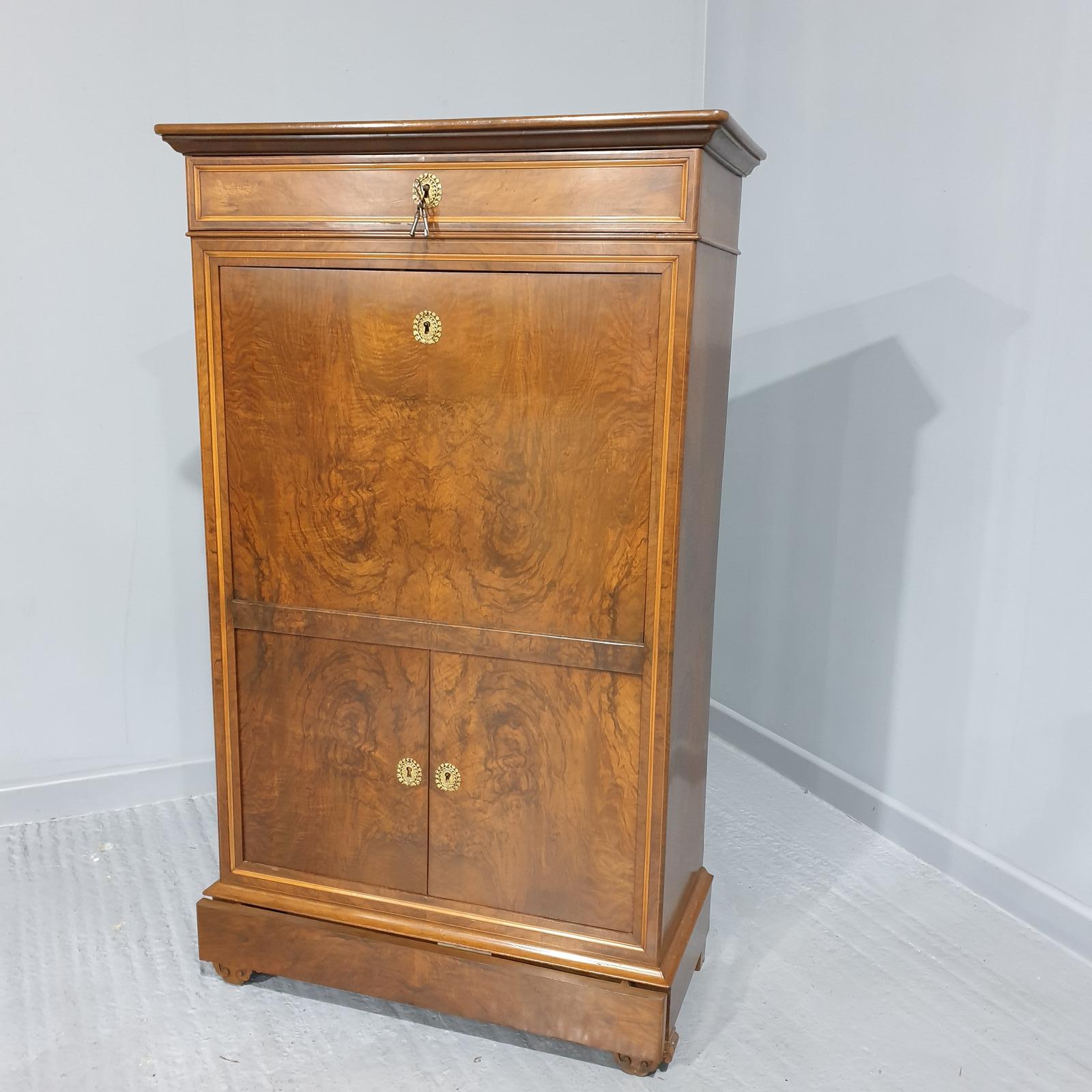 This is an outstanding burr walnut French bureau escritoire with all original keys, top drawer over the fall front which houses drawers pigeon holes, secret drawers and black leather writing surface, under is a twodoor cupboard with locking drawer then below that is a full width secret drawer disguised as the plinth, excellent colour and original condition.
