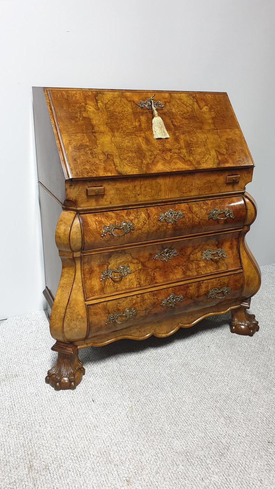 A very nice Dutch serpentine three-drawer burr walnut bureau, standing on huge paw feet, with brass handles, sections and working key, wonderful fitted stepdown interior, pull-out secret books, excellent colour and condition.