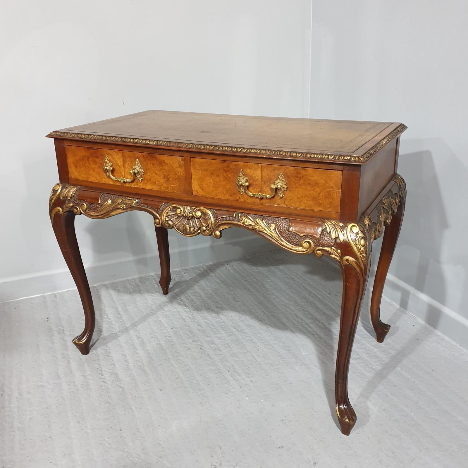 This is a superb burr walnut and parcel gilt two drawer writing desk with brass handles and good leather top, in excellent overall condition.