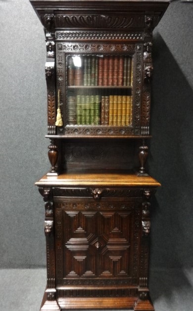 Excellent quality and with very crisp carvings, this slim bookcase comes into two pieces, glazed bookcase to the top and cupboard to the base, good colour and in very good condition.