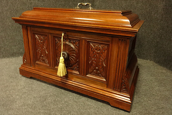 This is a superb walnut cellarette, wine cooler with a very unusual sliding lid, by Cope and Collinson, in original just waxed excellent condition, original inset castors, tin lining. can be used for magazine storage.