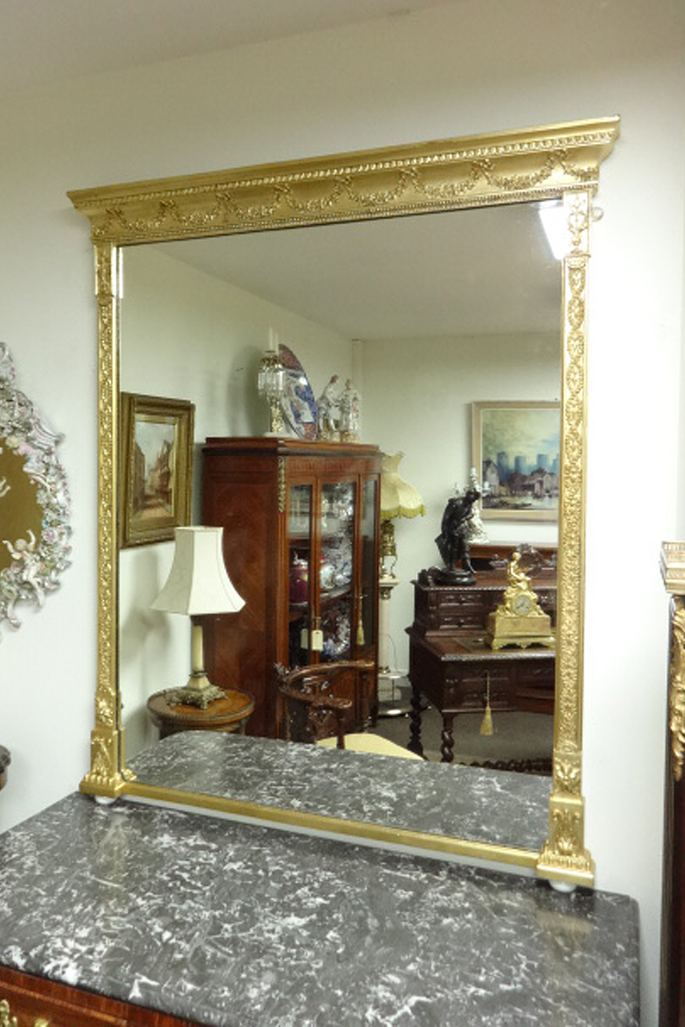 An outstanding English overmantle mirror, in very good condition, standing on original white porcelain feet, panelled back, slight foxing to mirror as expected.