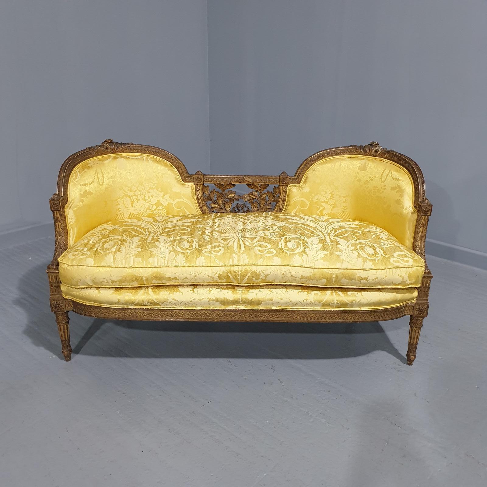 Exhibition quality French carved and gilded two seater carved sofa/settee/couch, exceptional carving, seperate original flock seat cushion, newly upholstered in Italian silk fabric, in excellent condition.