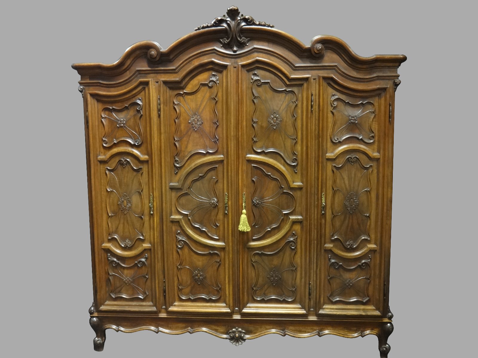 An outstanding four door French bombe shaped carved walnut wardrobe, with full width rail, in excellent condition. Flat packs for ease of maneuvering. Lovely bombe shaped panelled doors.