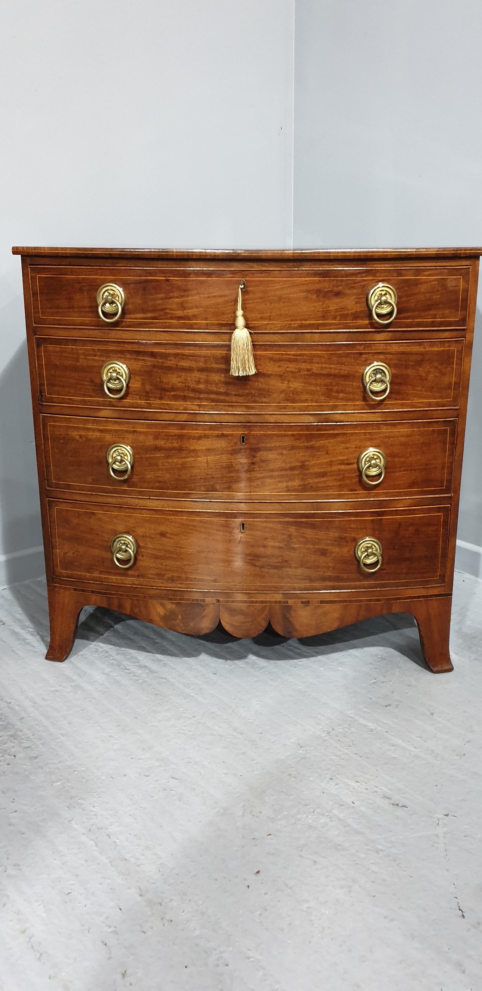 This is a lovely quality solid mahogany Georgian bowed chest of four drawers with original brass handles, inlaid drawers and crossbanded top, in overall excellent original condition.