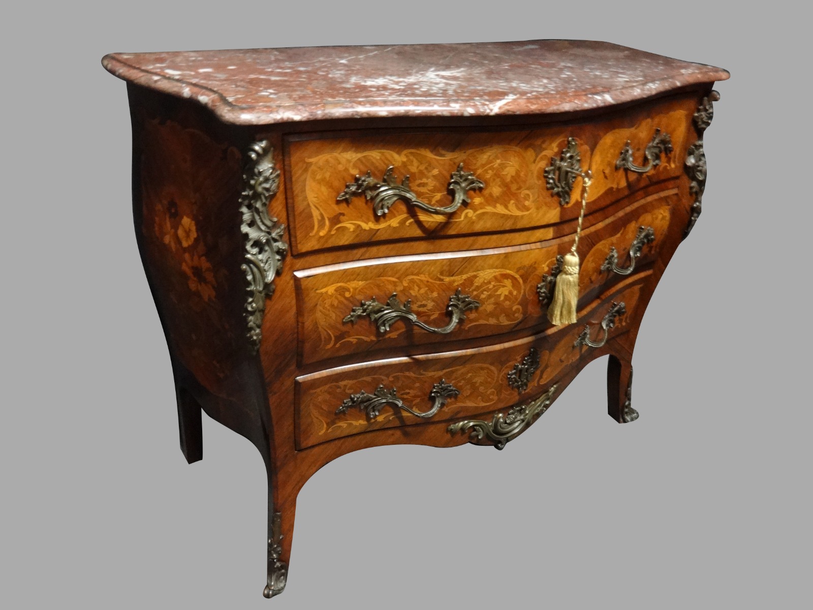 An outstanding French kingwood three drawer bombe shaped chest of drawers, with excellent marquetry panels, good bronze mounts and handles, oak lined and rouge marble top.