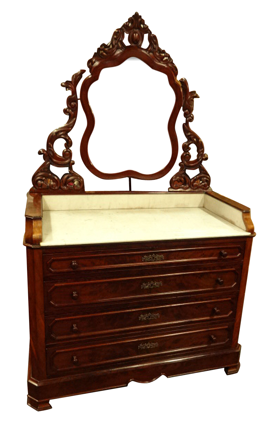 A very pretty mahogany dressing chest of drawers, four graduated drawers with turned mahogany knobs and brass escutcheons, good marble top, and a superb mirror, in very good original condition.