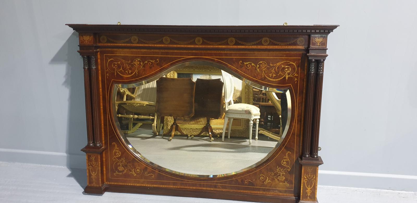 This is an excellent quality Edwardian antique mahogany overmantle mirror profusely inlaid with marquetry panels, original bevelled mirror, in excellent original condition.