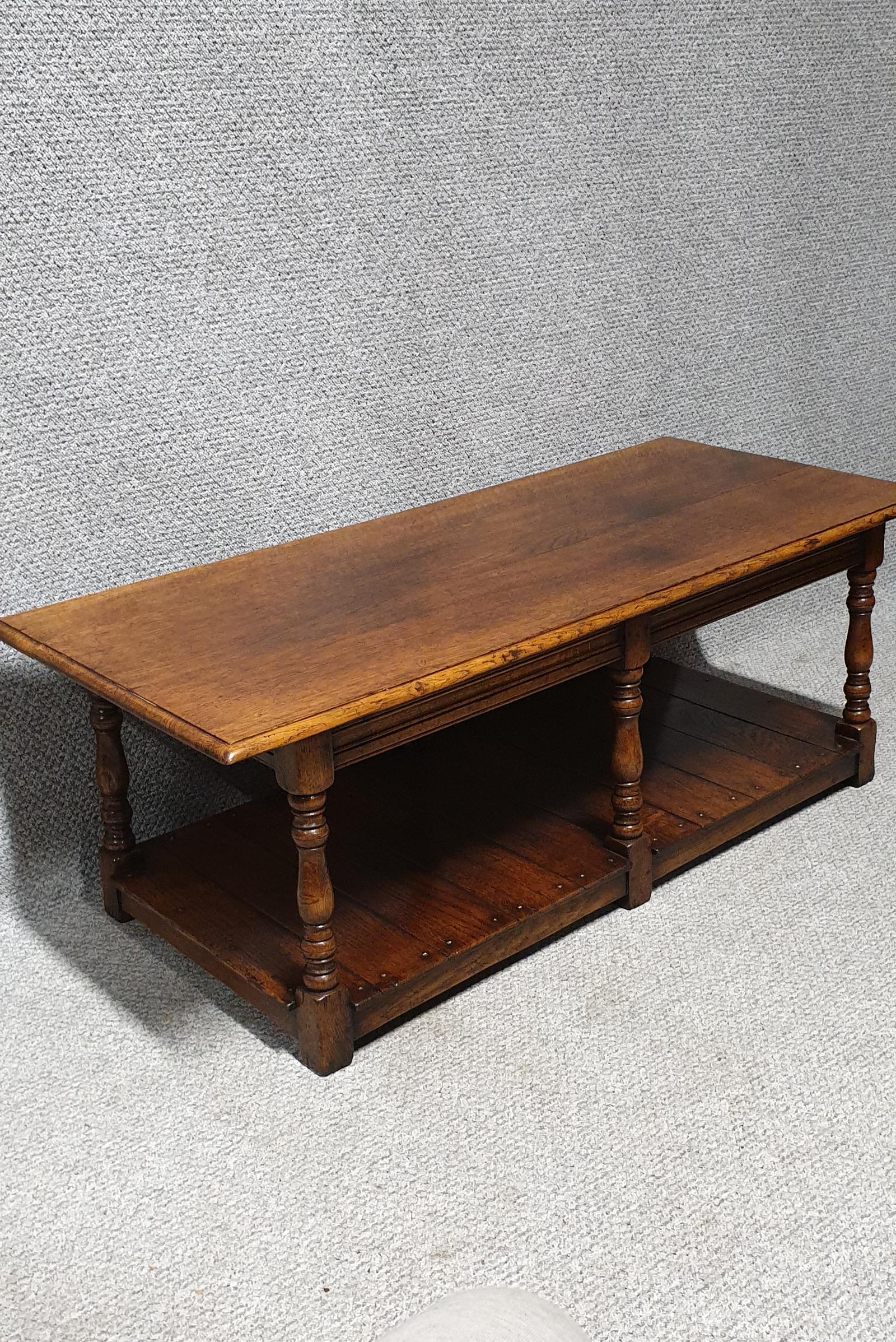 A top quality solid oak, plank topped coffee table with under tier, six legs, excellent colour and condition.