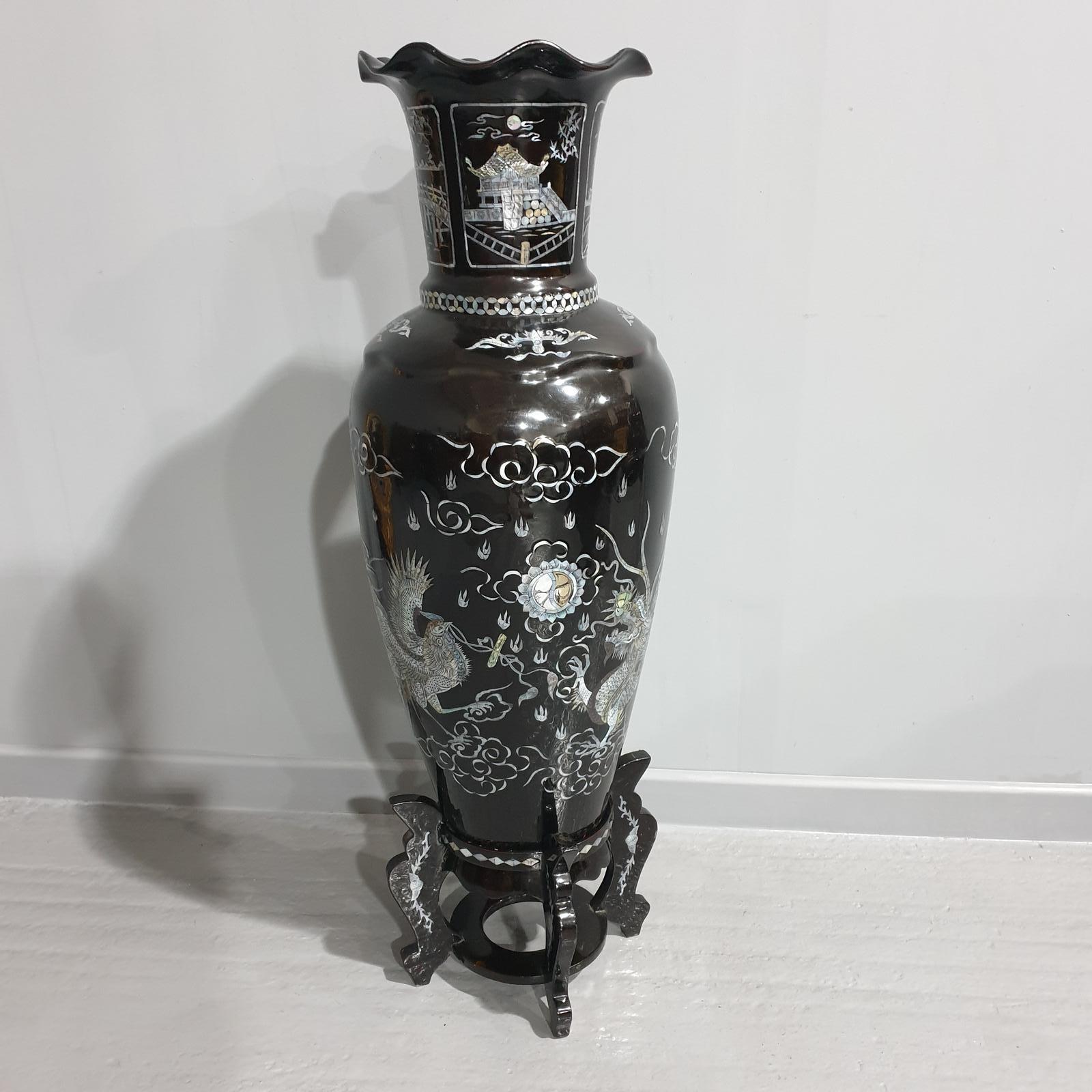 A superb quality large oriental floor standing vase on seperate stand, paper mache inlaid with mother of pearl, depicting Ho Ho bird and four toed dragon chasing a pearl. in excellent original condition.