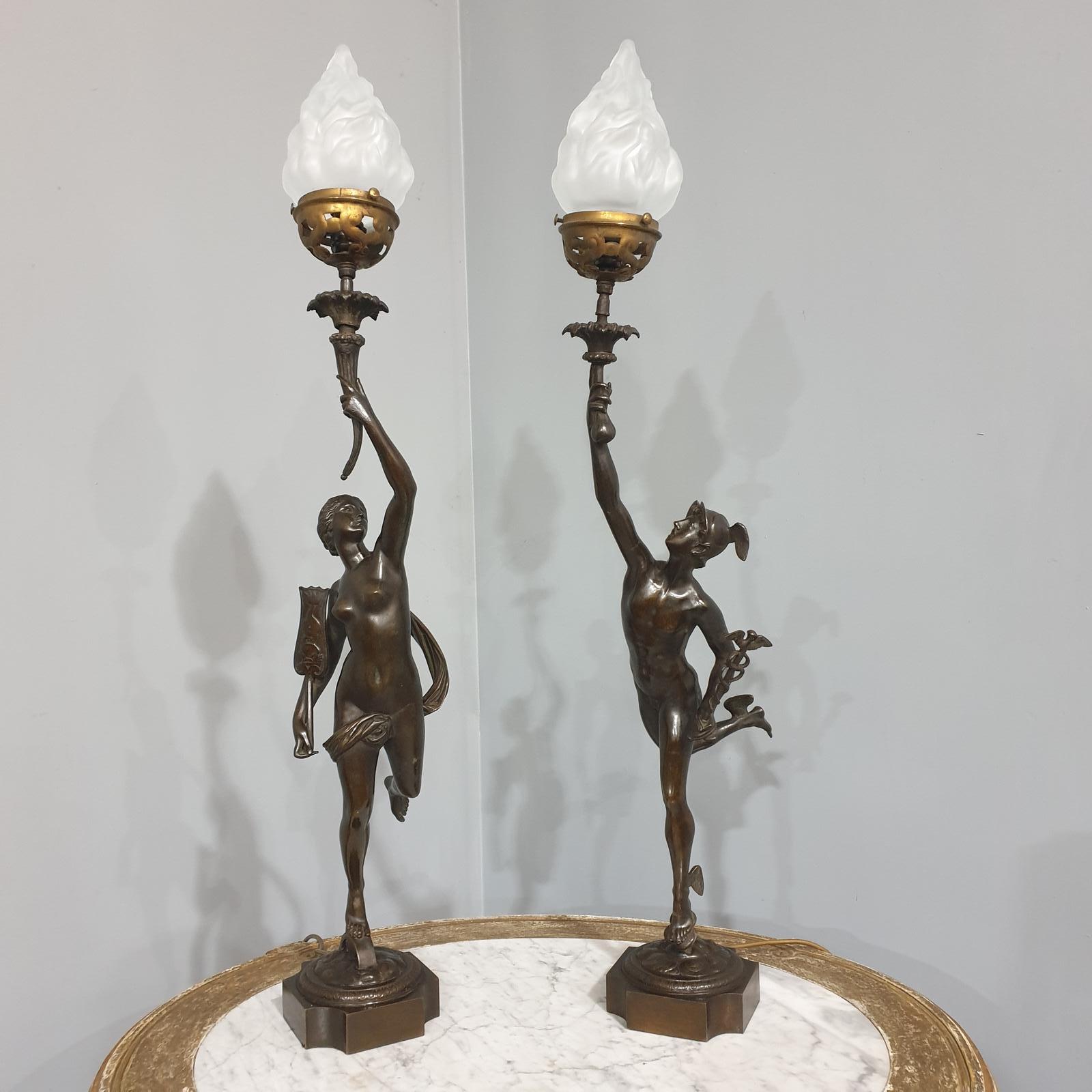 Superb pair of antique bronze table lamps with glass flame shades, in excellent overall condition.