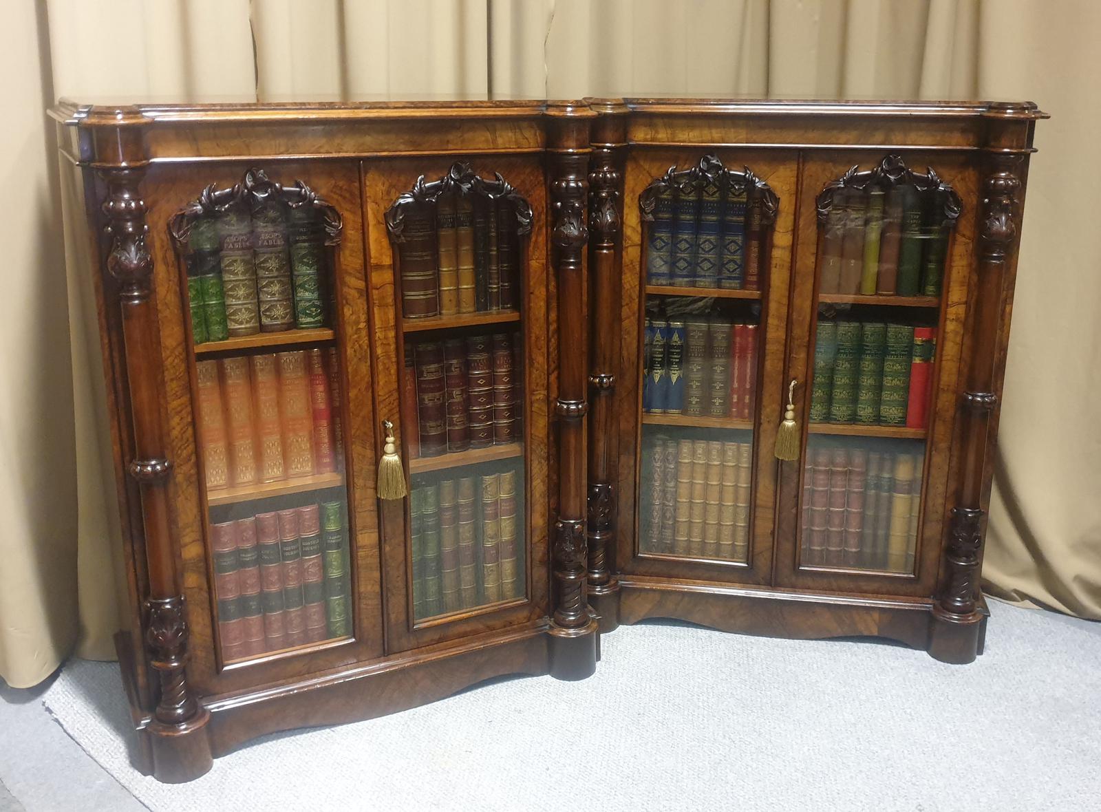 A wonderful pair of Victorian walnut bookcases with three polished edge adjustable shelves in each (only two shown). very crisp carvings to the arched top doors, crisp columns, breakfront, in excellent original condition with a wonderful colour and original working locks.