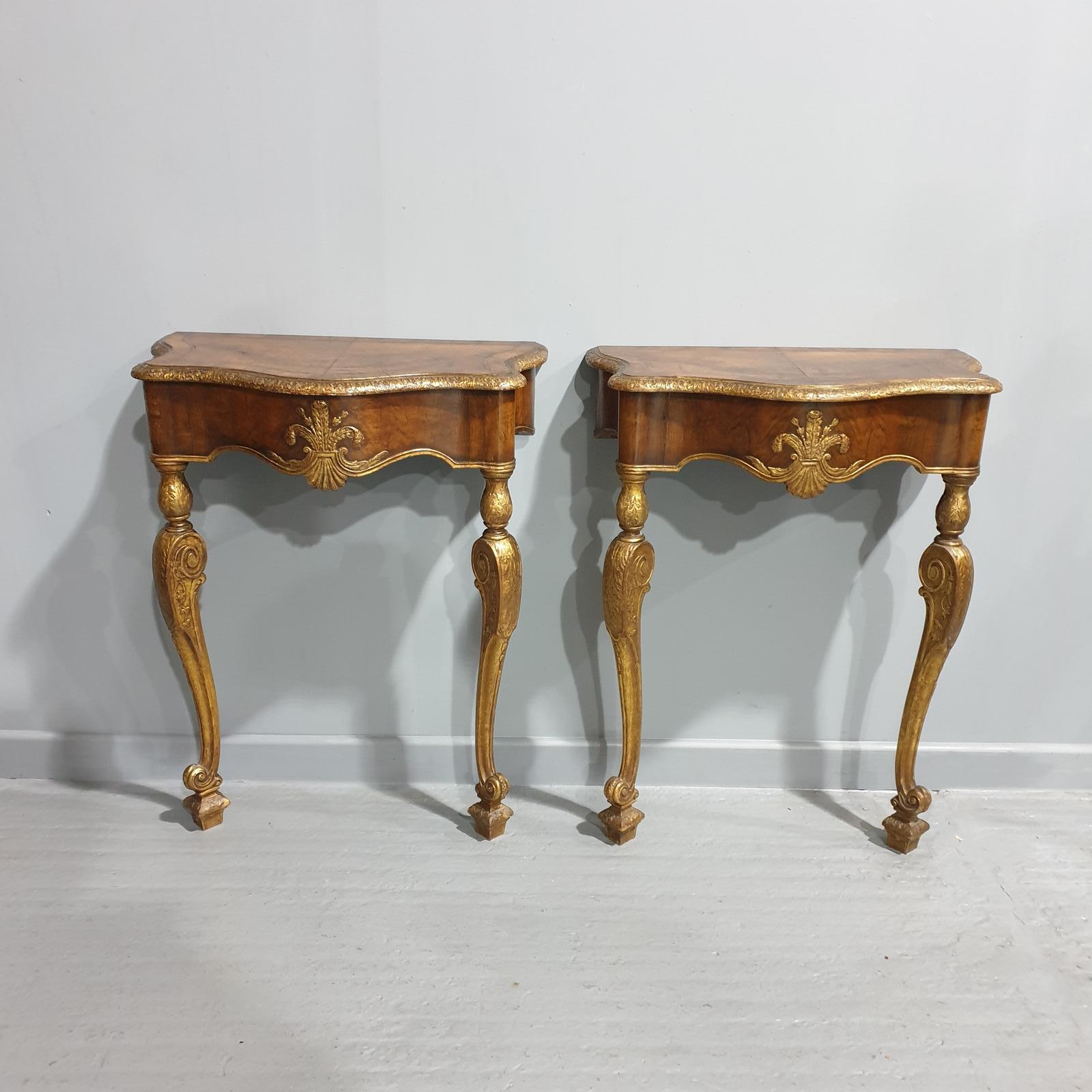 These are a superb pair of walnut and parcel gilded deep serpentine console tables, standing on tall parcel gilded cabriole legs, in super overall condtion.