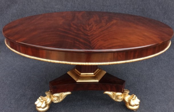 An outstanding 19th Century antique mahogany dining table with solid mahogany top. It stands on a triform base with large ball and claw feet, gilded feet, collar and beaded edge, in fantastic condition, flip top.