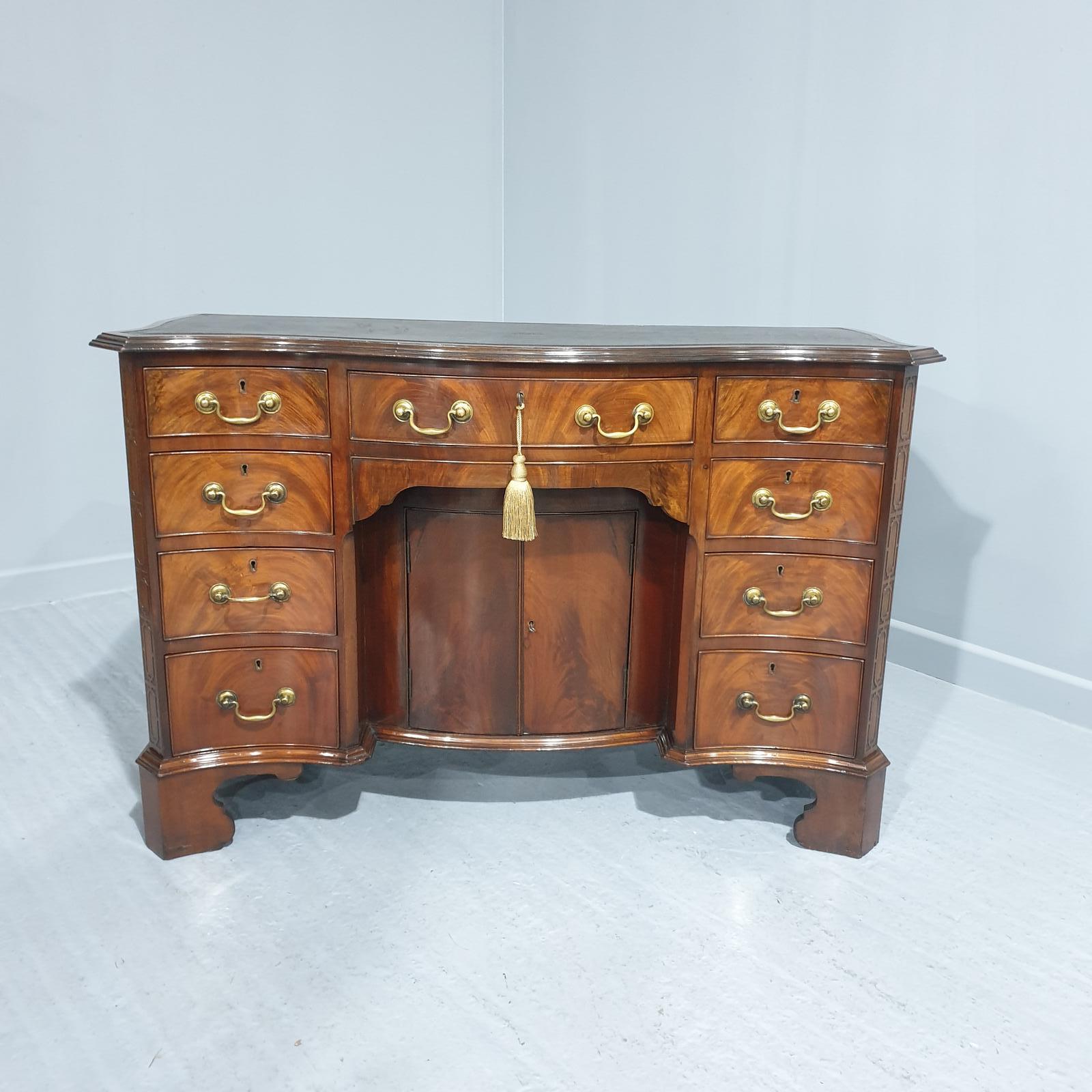 This is a superb quality serpentine flame mahogany kneehole desk of nine drawers and cupboard under, original brass swan neck handles, early Victorian locks, canted corners, standing on bracket feet and oak lined throughout, made by Marsh Jones and Cribb, Leeds, excellent colour and condition.
