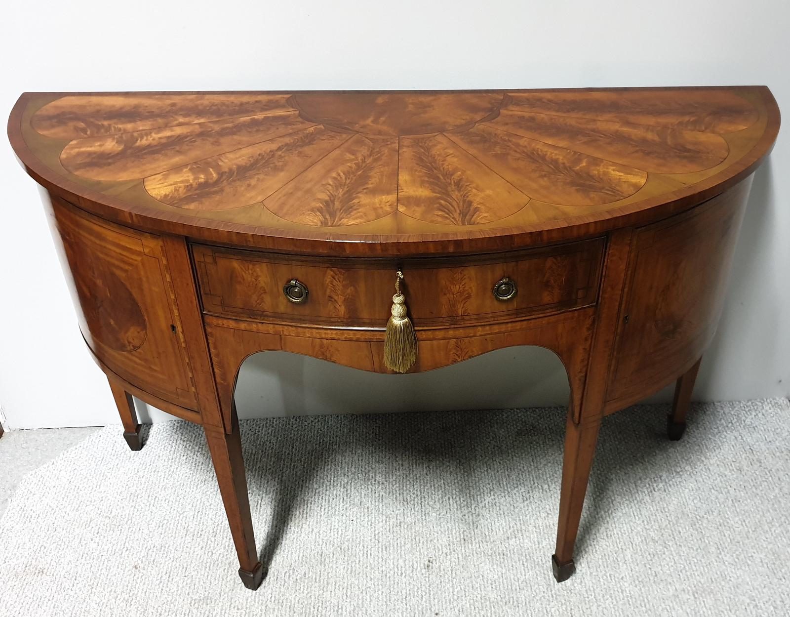 A very nice Sheraton revival demi loon sideboard, standing on spade legs, single oak lined drawer with bowed doors either side, magnificent sunburst top in satinwood, walnut, rosewood and harewood, in lovely original condition.
