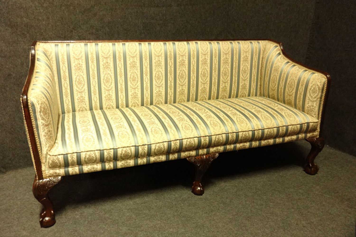 This is a very good Victorian antique mahogany couch, sofa, with original regency stripe material, standing on carved cabriole legs, and in very good original condition.