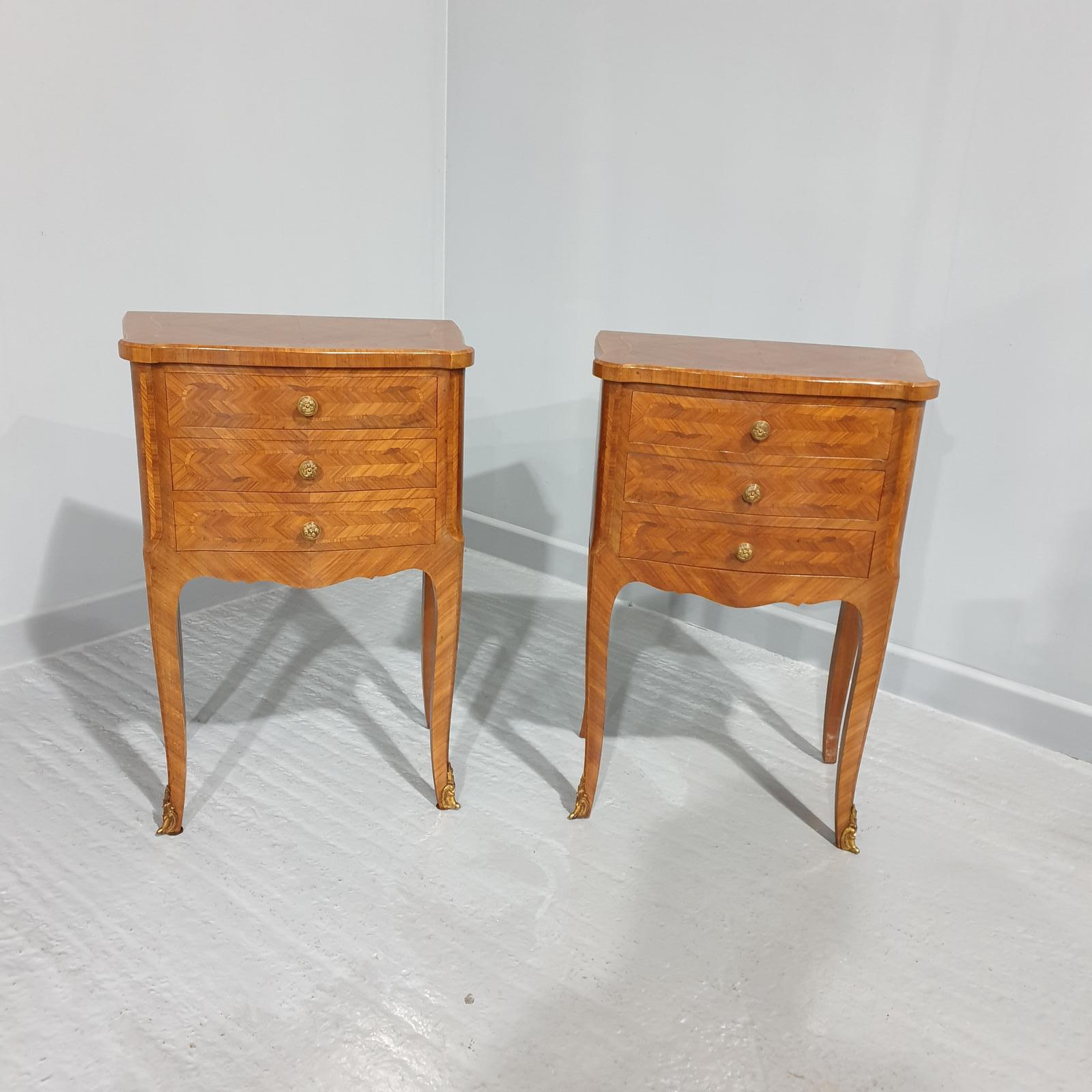 A very good pair of French tulipwood and marquetry oversized bedside lamp tables, with lovely brass knobs and feet, in excellent overall condition.