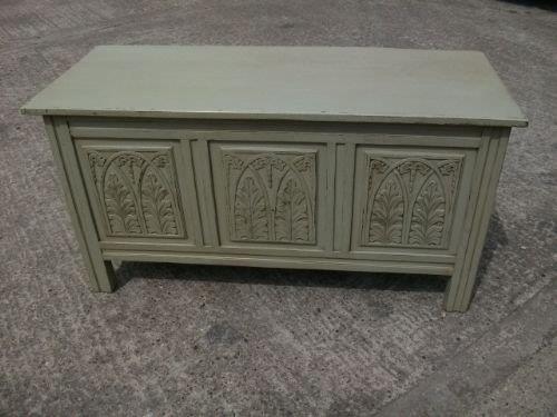 A stunning vintage 1920's carved oak coffer with three panels painted in French Grey with a distressed look.