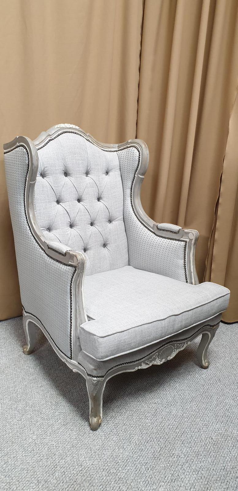 Recently upholstered wing armchair. Covered in Laura Ashley fabric, frame in original grey paint, excellent condition.