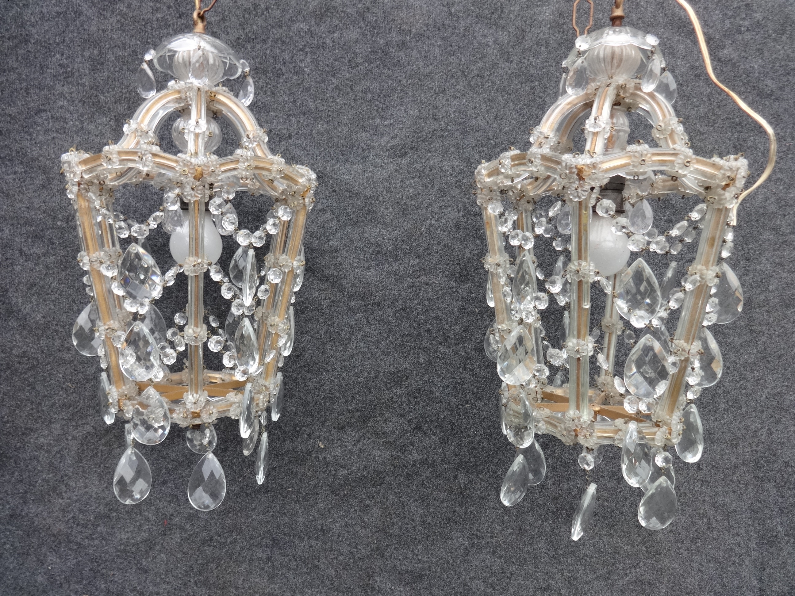 large cut crystal droppers, glass frame with brass centers daisy corners, in excellent condition