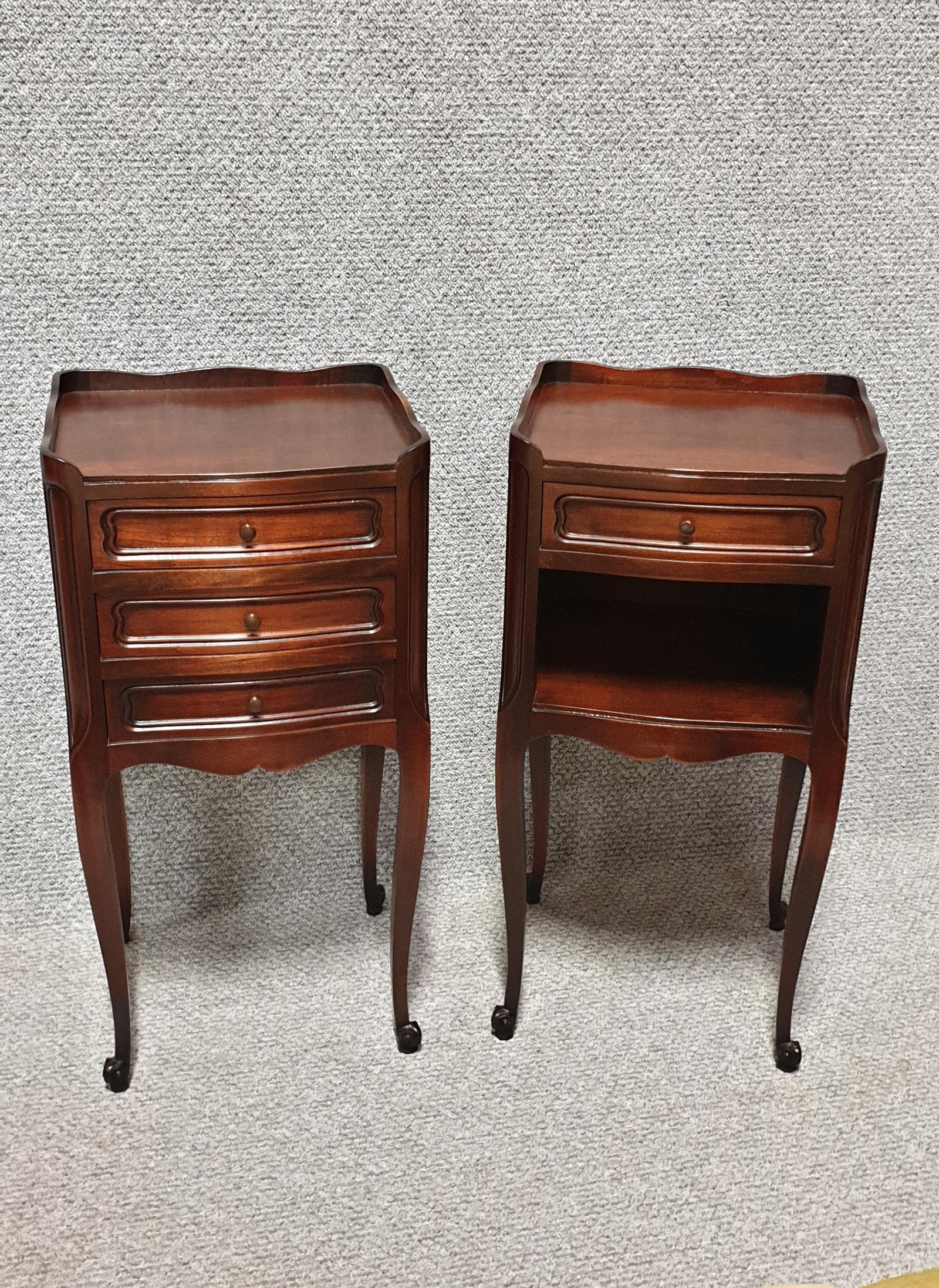 A very good pair of French mahogany tray topped bedside chests of drawers with brass handles, excellent colour and condition