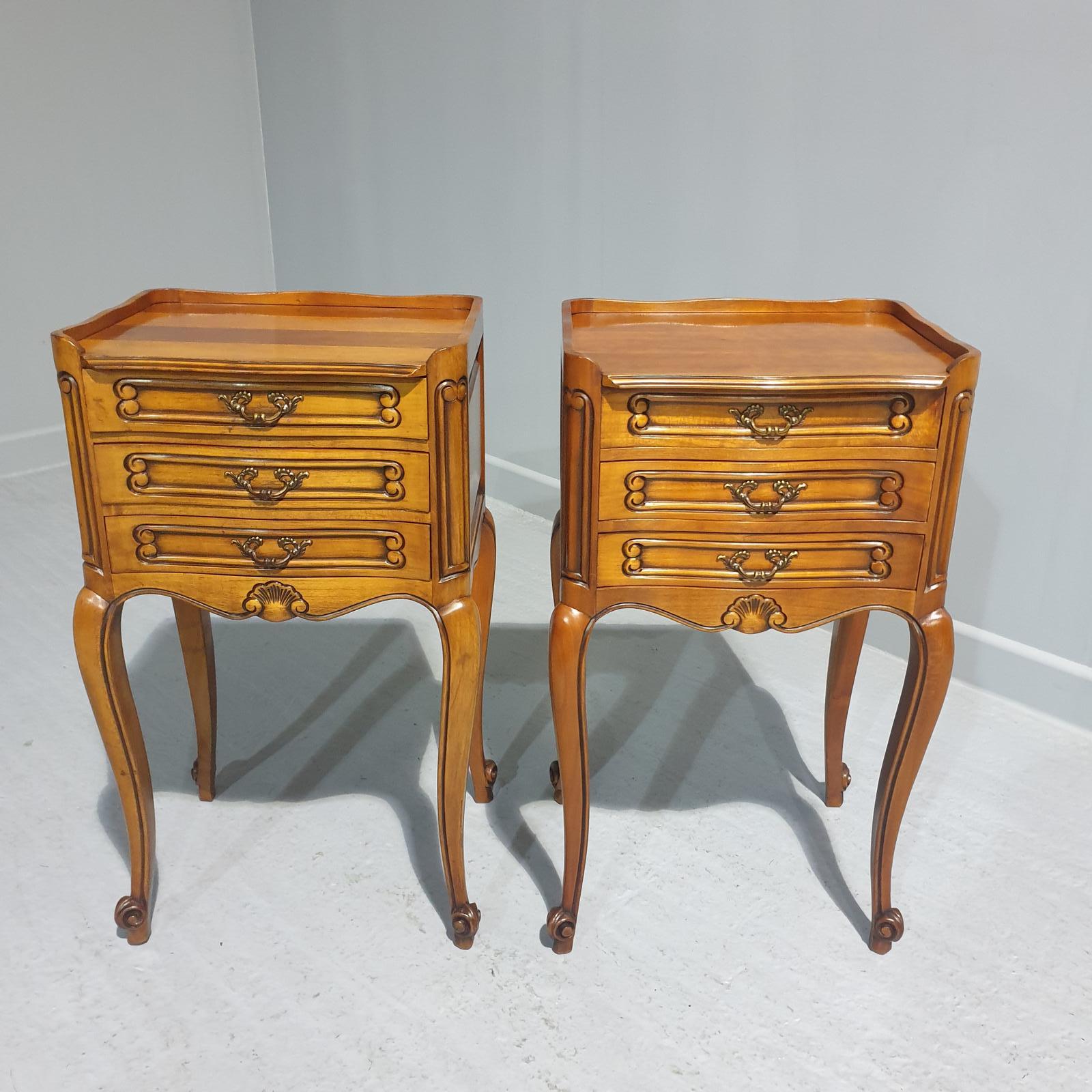 A good pair of French mahogany bedside lamp tables with three drawers, brass handles and standing on cabriole legs.