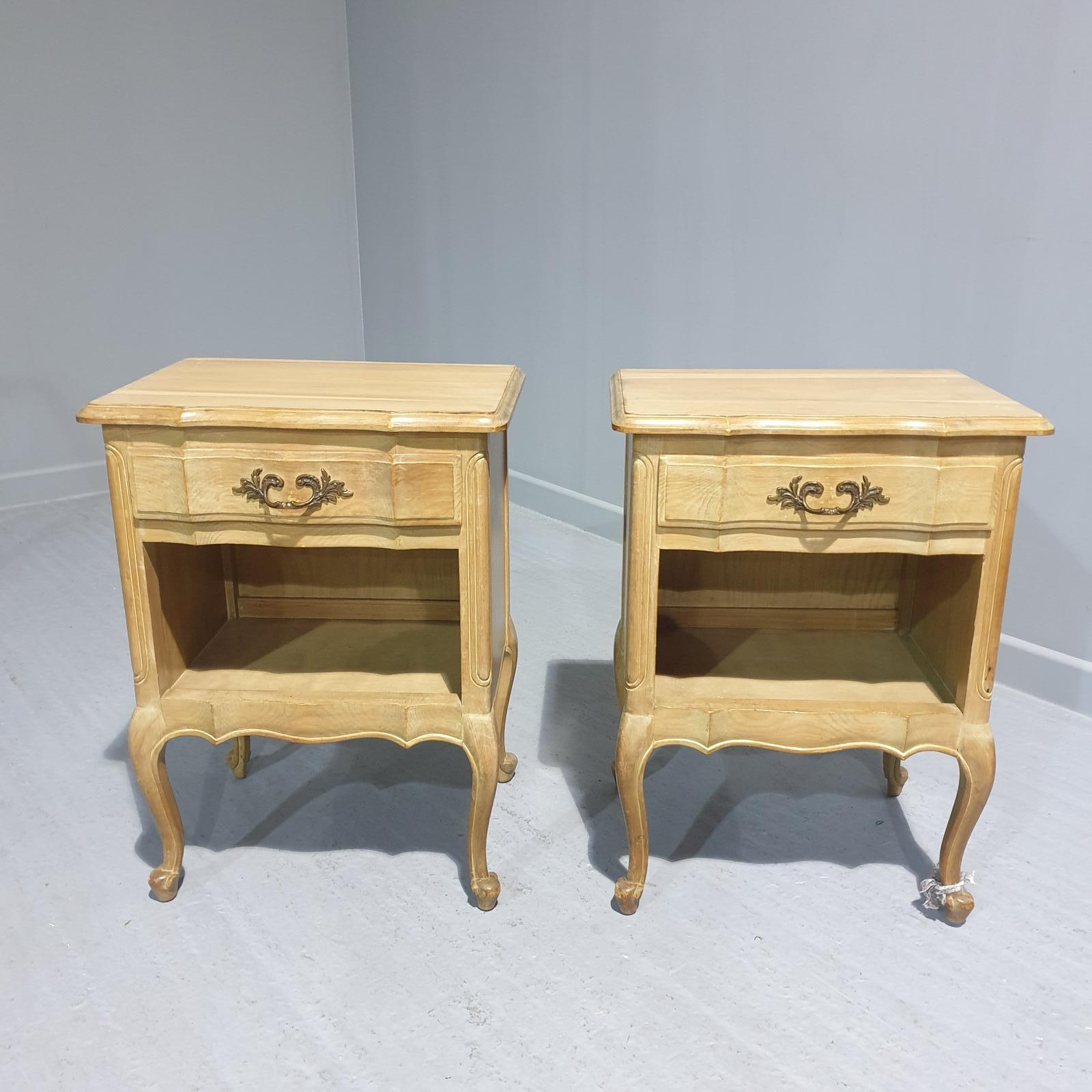 A very good pair of French pine bedside cabinets with single drawer, standing on cabriole legs.