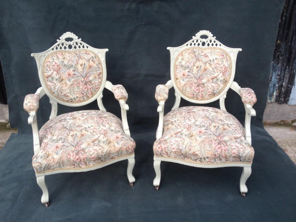 A pair of vintage French Victorian Painted Armchairs with original porcelain castors.