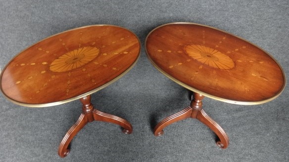 This is a very pretty pair of inlaid tables with brass edges. It is in good original condition.