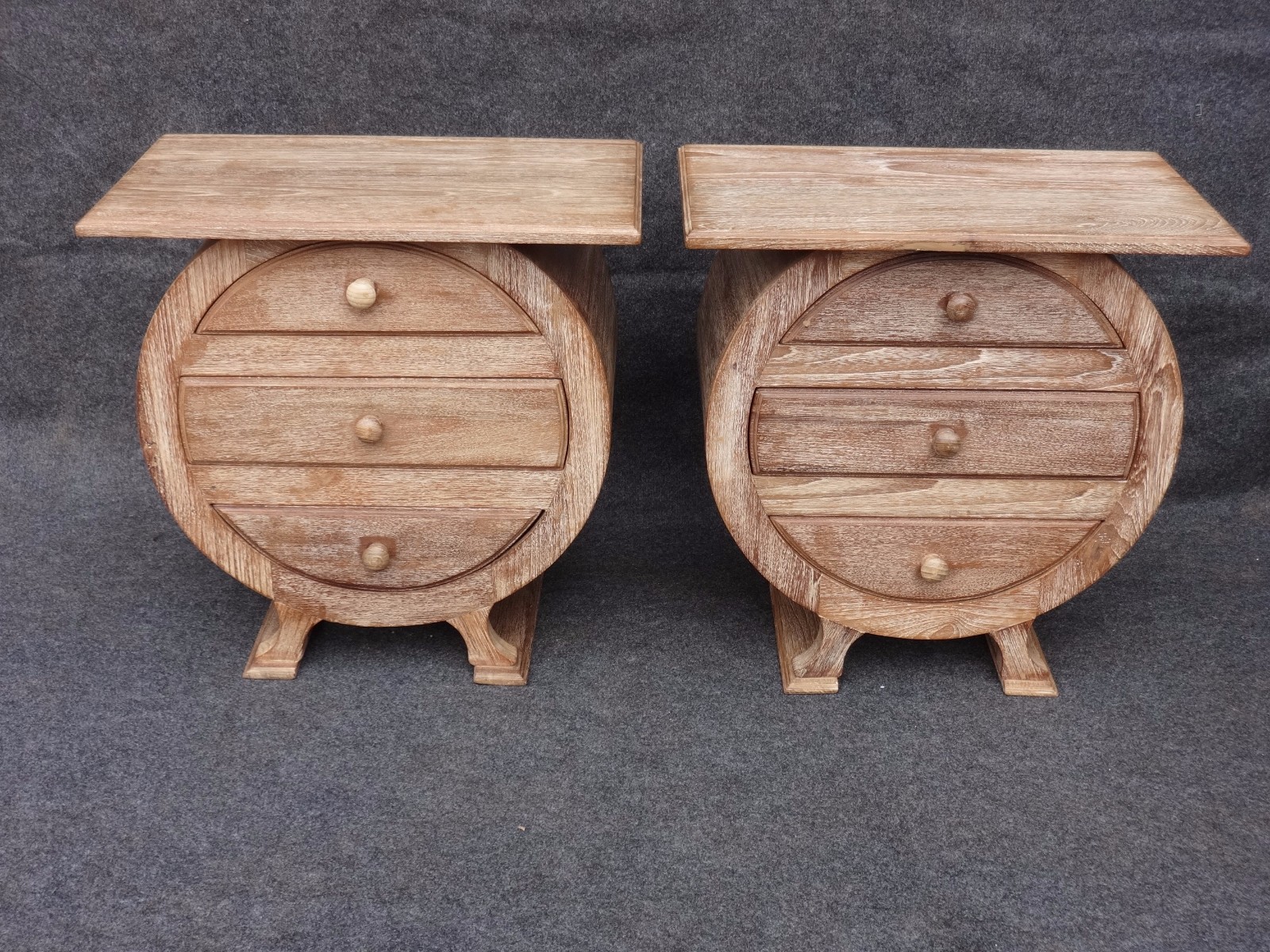 These are a good pair of limed teak chests of drawers, round structure with 3 graduated drawers, standing on small legs.