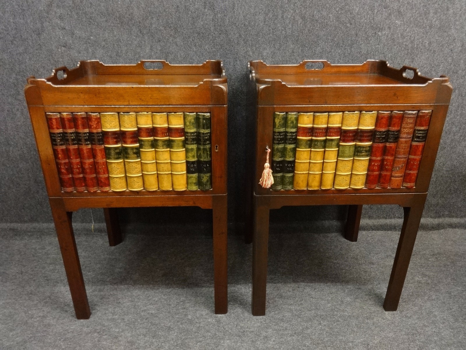 These are a stunning pair of Georgian style bedside cabinets with false bookends on doors, tray tops, with original key, in good original condition.