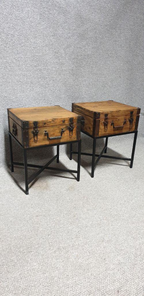 A unique matched pair of antique pine ammunition chests on later stands, metal hinges, corners and handles, open to reveal storage, waxed and cleaned ready for the home, excellent colour and condition.