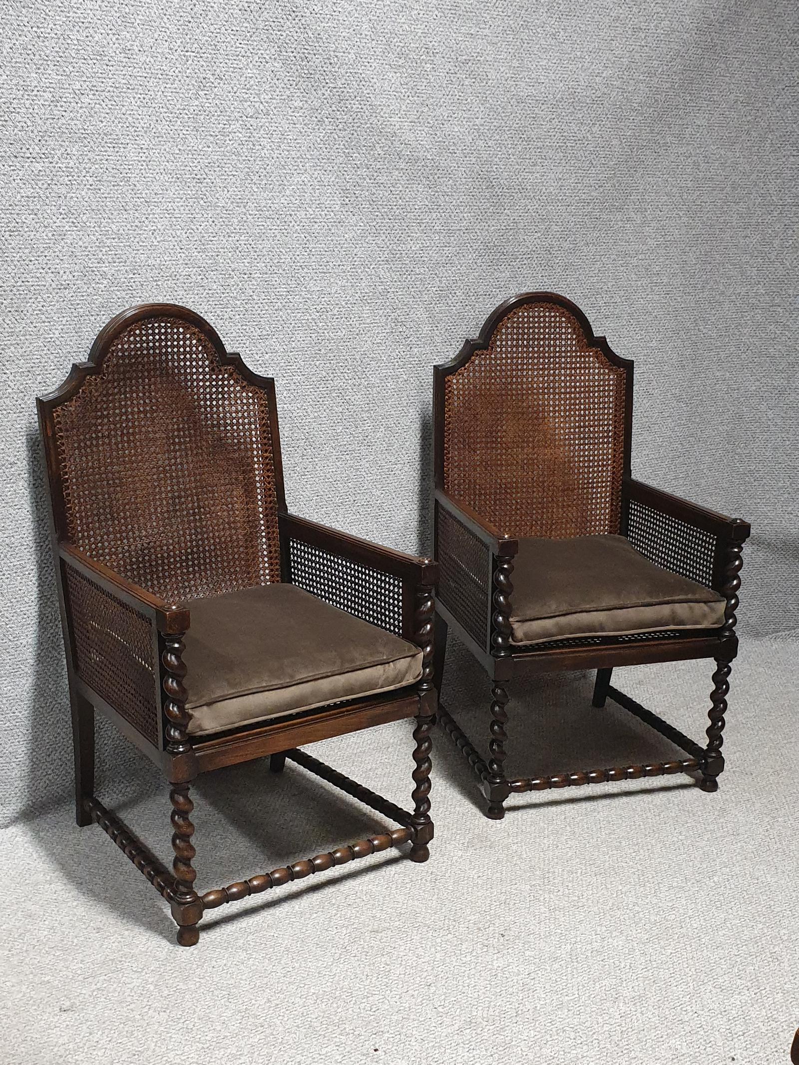 A great pair of barley twist bergere armchairs with removable silver brown cushion pads.
