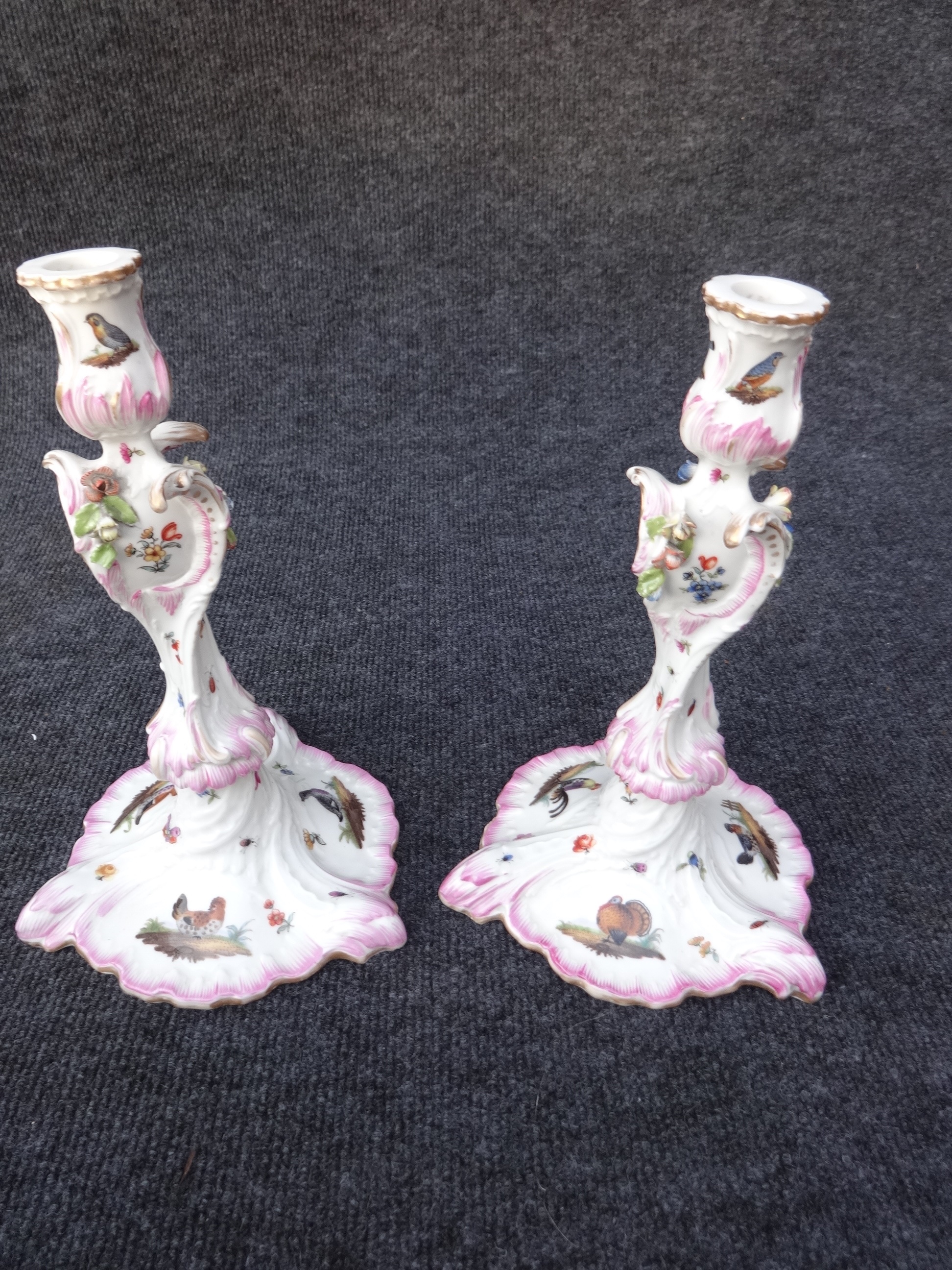 Offered for sale are these fantastic large pair of Berlin candlesticks which have been handpainted with birds, insects, flowers and gamebirds.