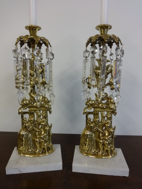 These are a good pair of 19th Century antique brass lusters with white marble bases, cut glass droppers, all in excellent condition.