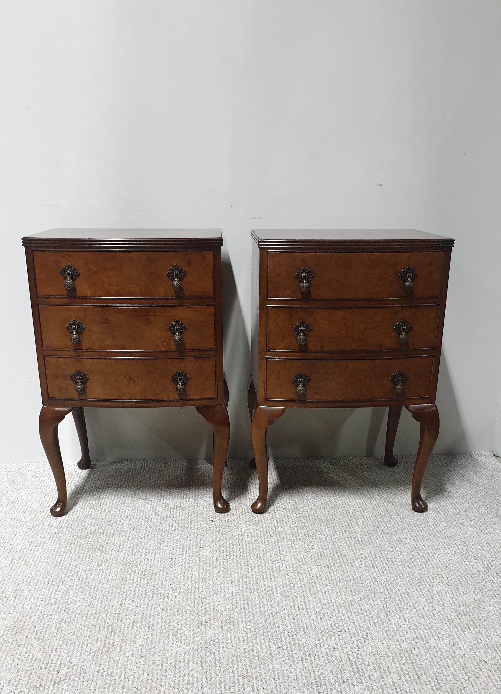 A very nice pair of burr walnut bowed three drawer chests of drawers, lamp chests or bedside chests, brass handles, in excellent original condition.