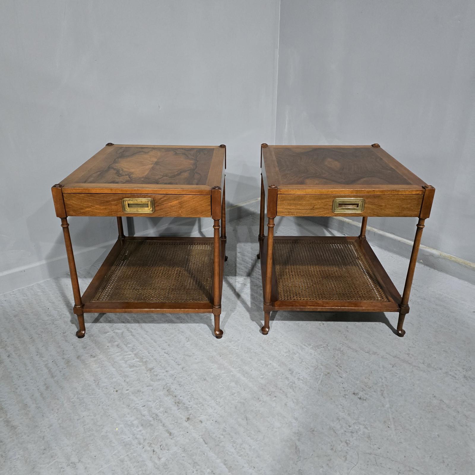 These are a very nice pair of figured walnut lamp tables with bergere under-tier, single oak lined drawer with brass inset handle, freestanding and in lovely condition.