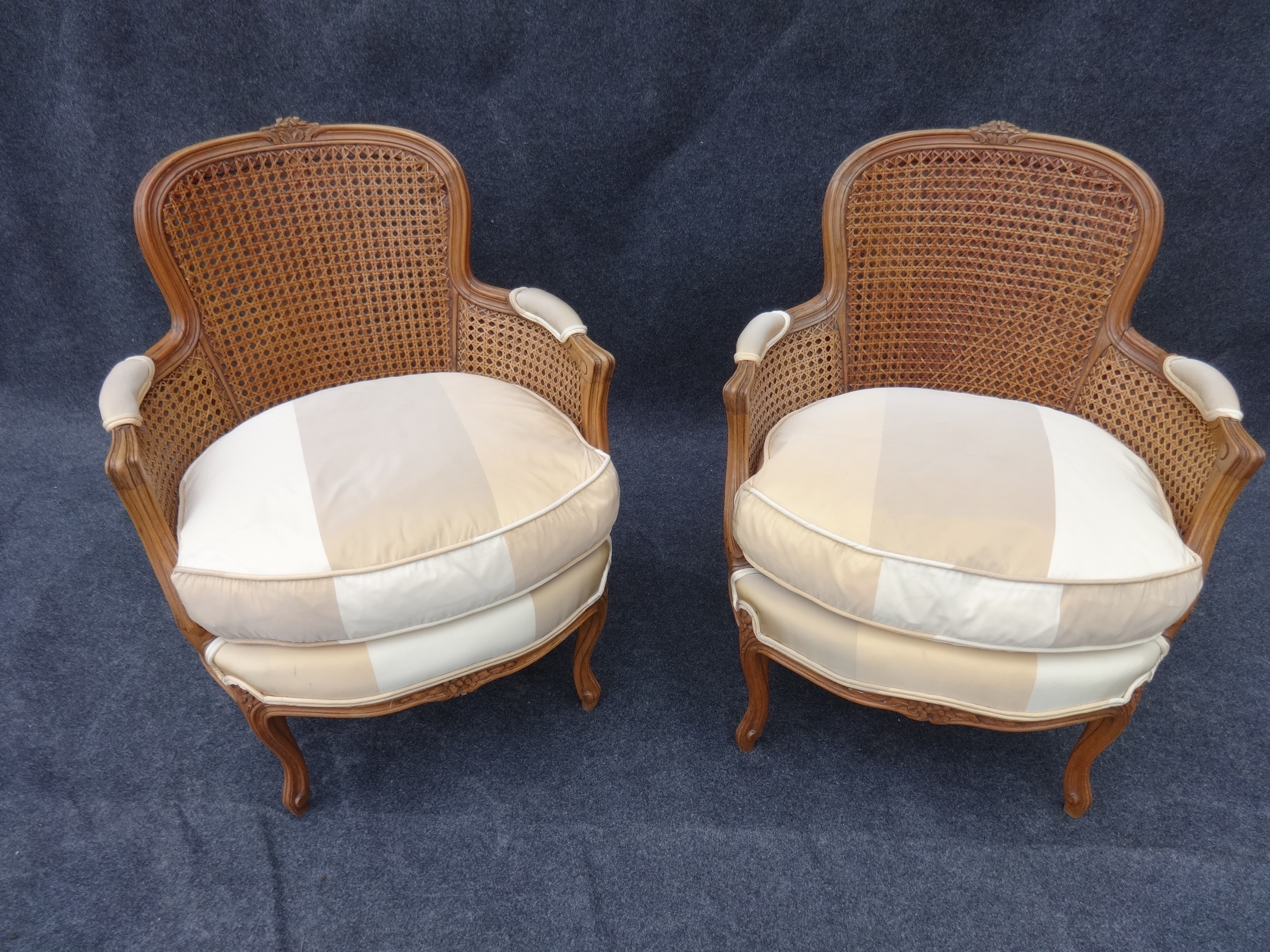 Offered for sale are these fantastic pair of double caned bergere chairs with sprung seating, ivory silk upholstery, bergere is in excellent condition as is the upholstery.