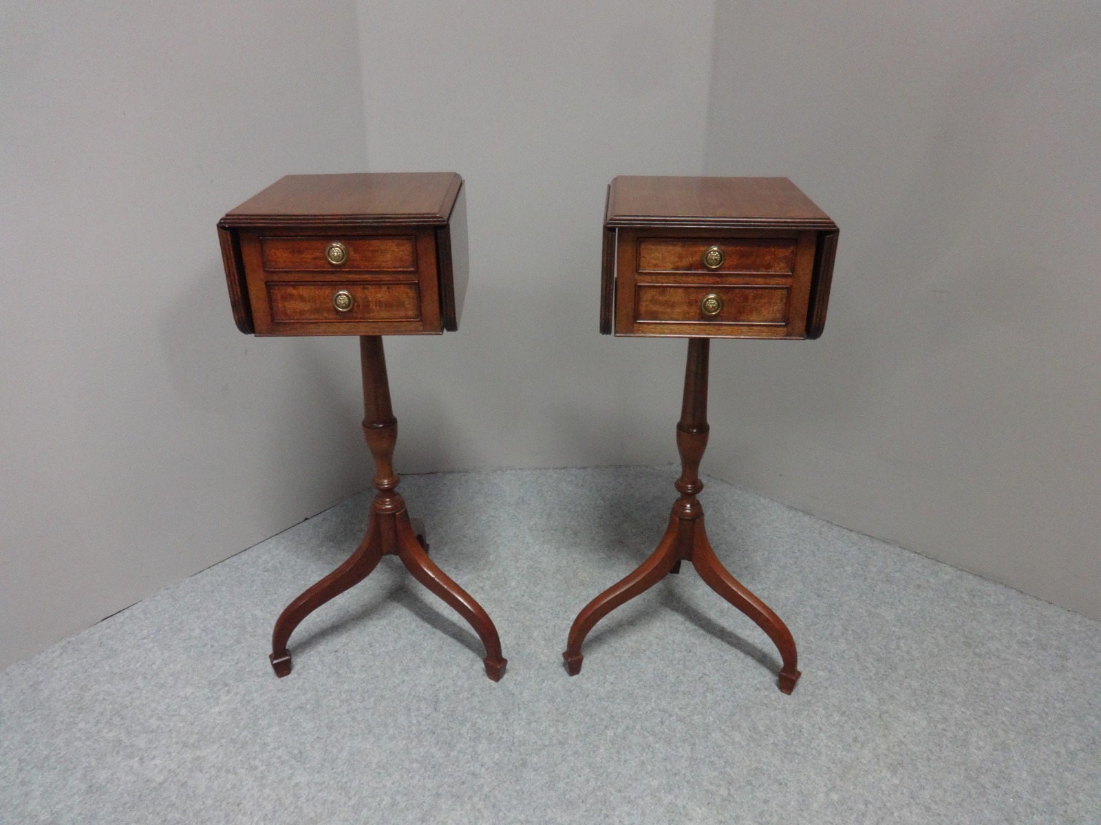 These are a super pair of mahogany drop flap, wine tables with two drawers, lion ring handles, standing on turned column, excellent colour and condition.