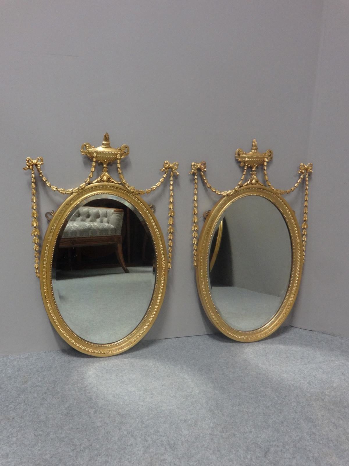 A beautiful pair of English Regency wall mirrors, urns atop swags and bows, bevelled edge original plate mirrors (slight foxing) nothing detrimental but can be resilvered, in very good condition.