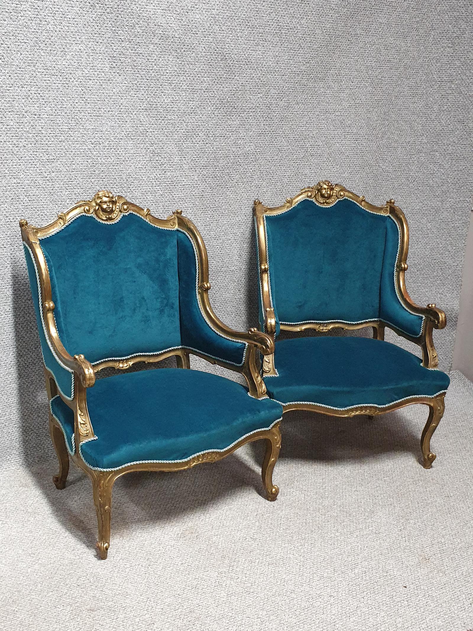 A great pair of French gilt fauteuils, newly upholstered in Teal velvet, great condition.