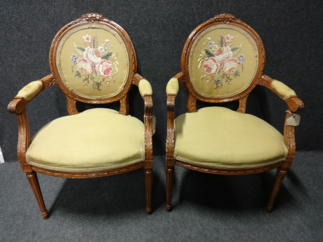 These are a good pair of French antique boudoir chairs, Salon chairs, with exquisite needlework panels to the back, frames in excellent condition.