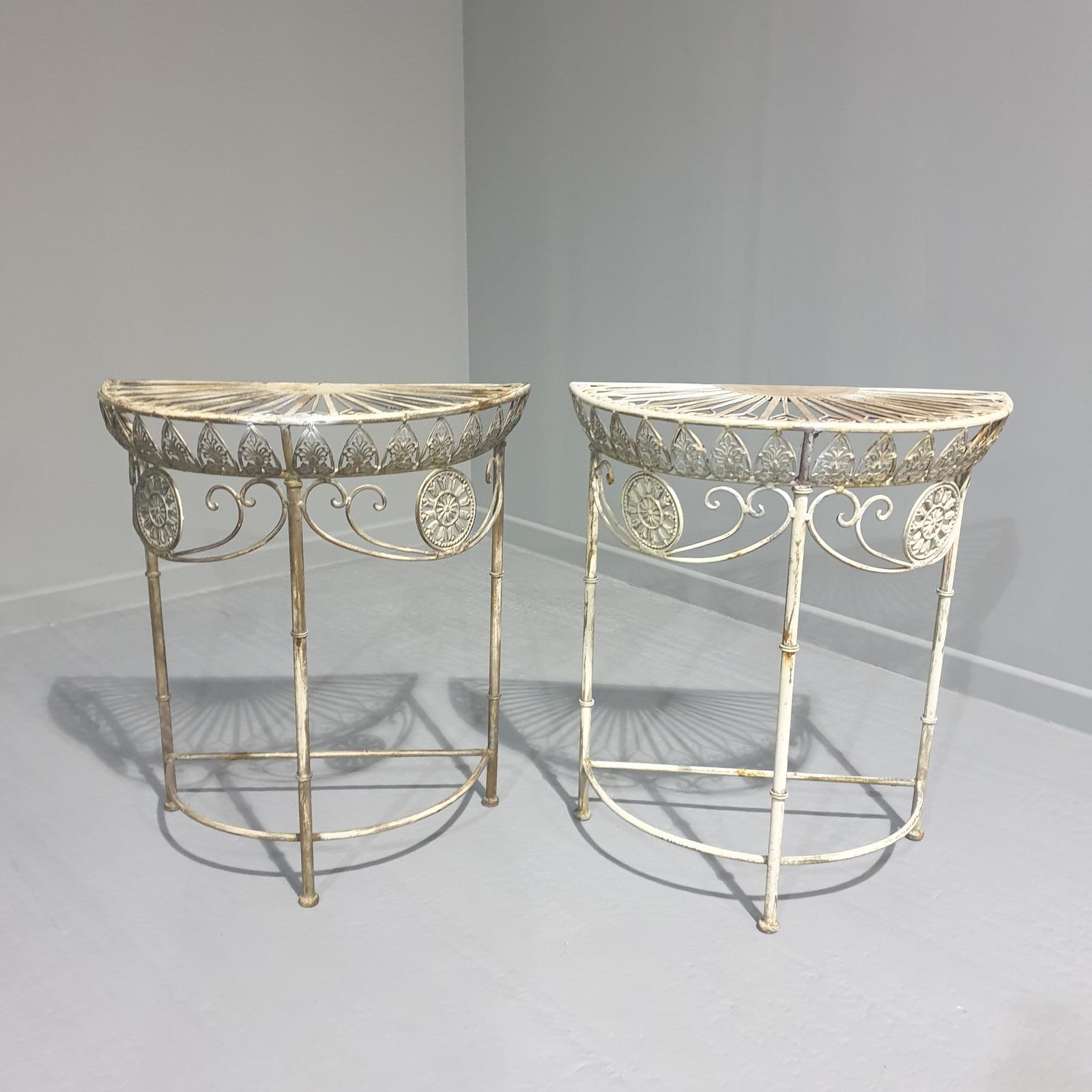 These are a very good pair of original painted 19th Century French antique console or conservatory tables, made of wrought iron.