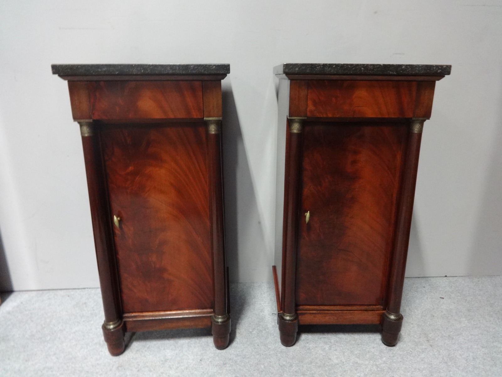 A good pair of 19th Century French Empire antique mahogany bedside cabinets with single drawer and door, dark grey marble tops, brass mounts to the columns in excellent condition.