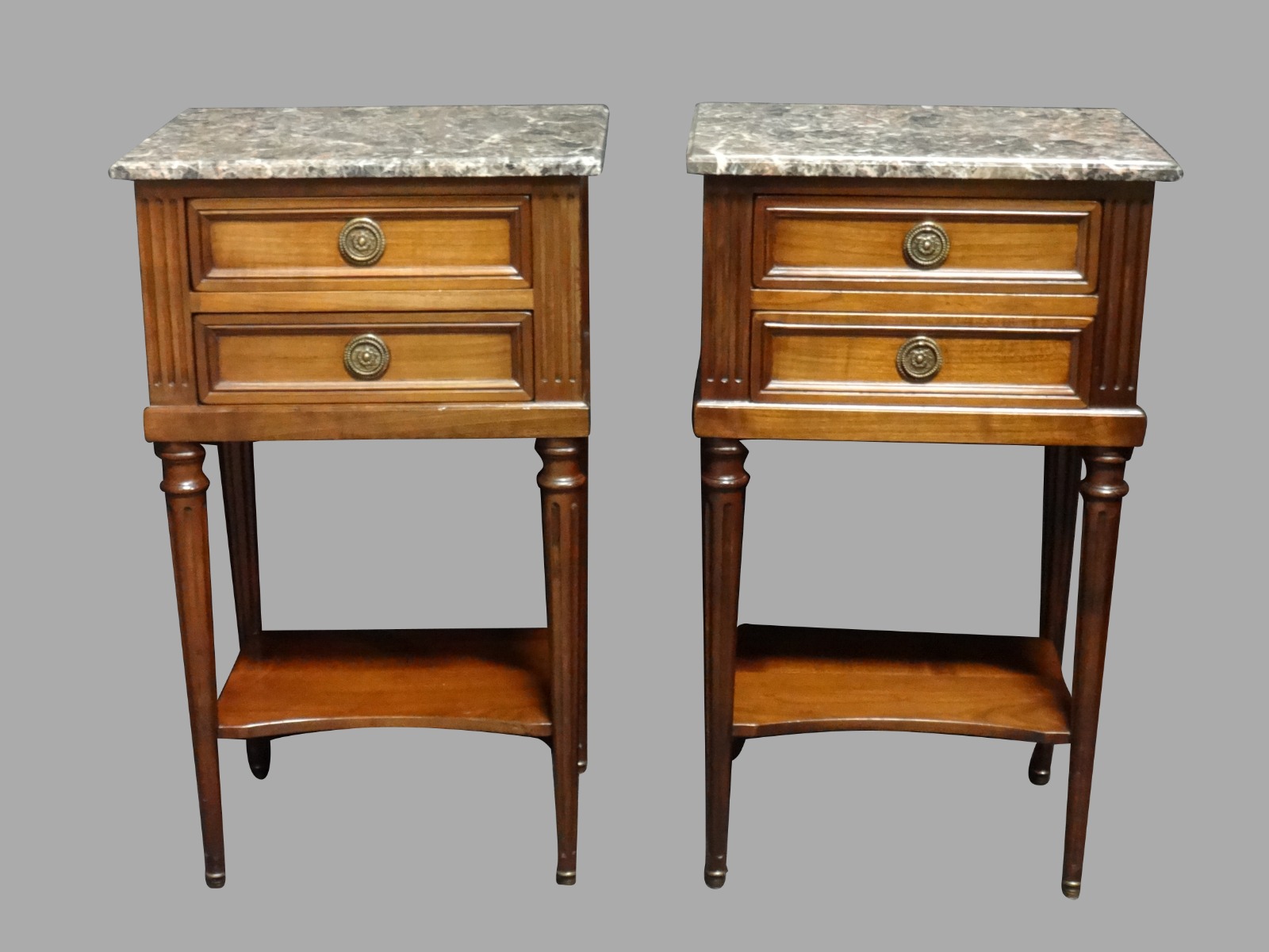These are a good pair of French mahogany bedside chests, two drawers and potboard base, brass tips to the feet, and very good marbles, in excellent condition.