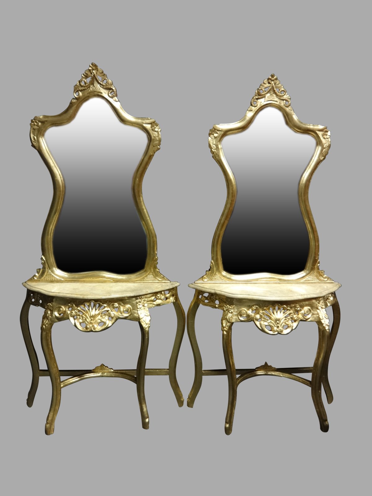 These are a good pair of giltwood console tables with cream marble tops, matching giltwood waisted mirrors, bevelled mirrors in excellent condition.
