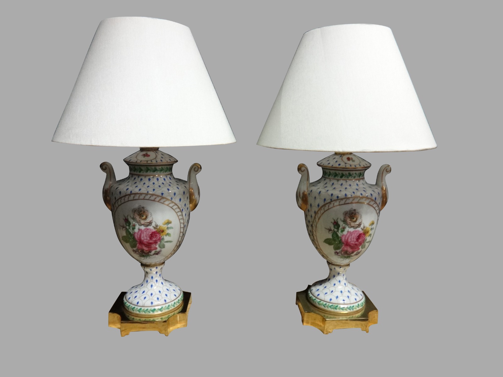 These are a very good pair of French porcelain table lamps with hand painted roses and brass stands.