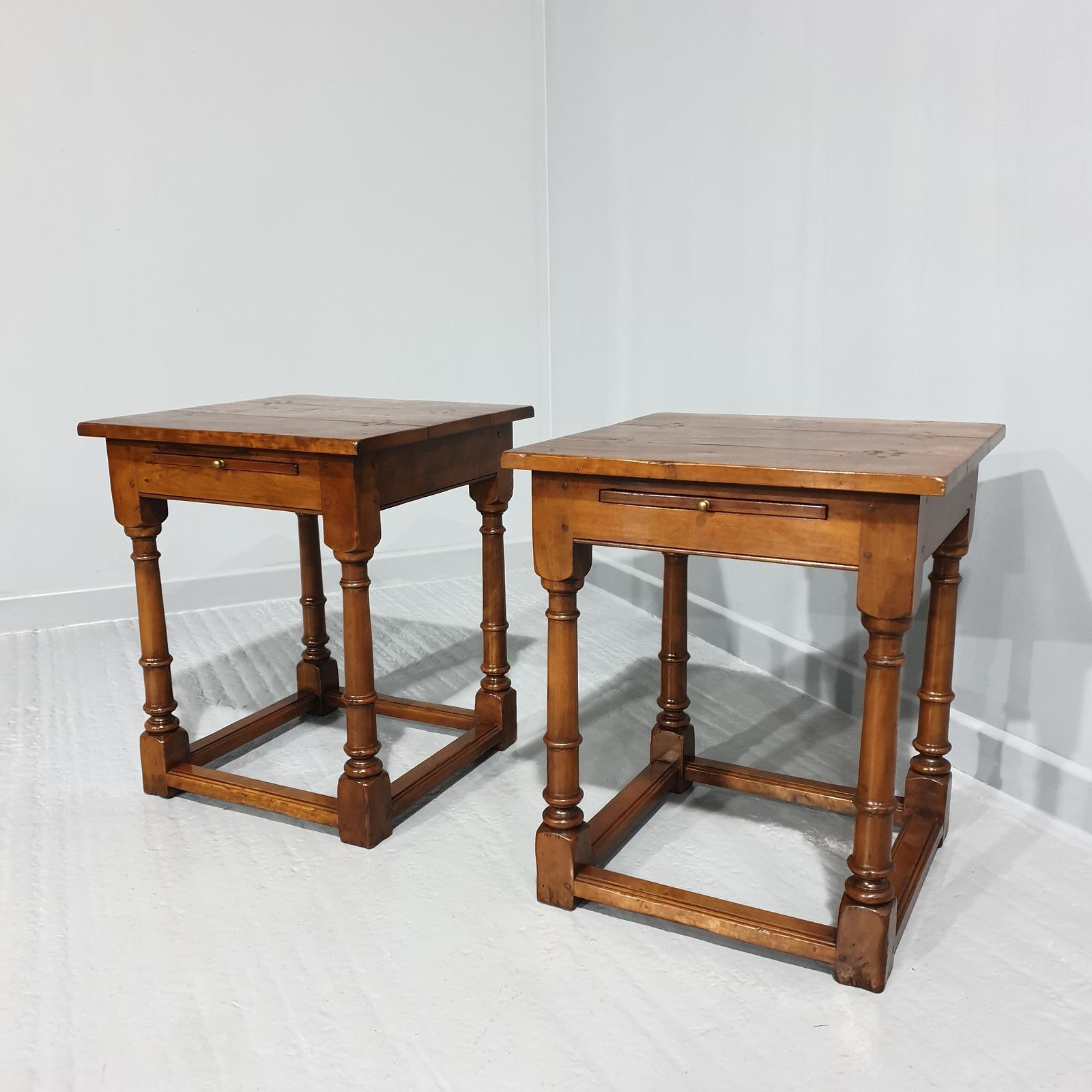 Pair of early 20th Century French antique cherry wood lamp or bedside tables, with single pull out tray, peg jointed throughout, plank tops, overall excellent condition.