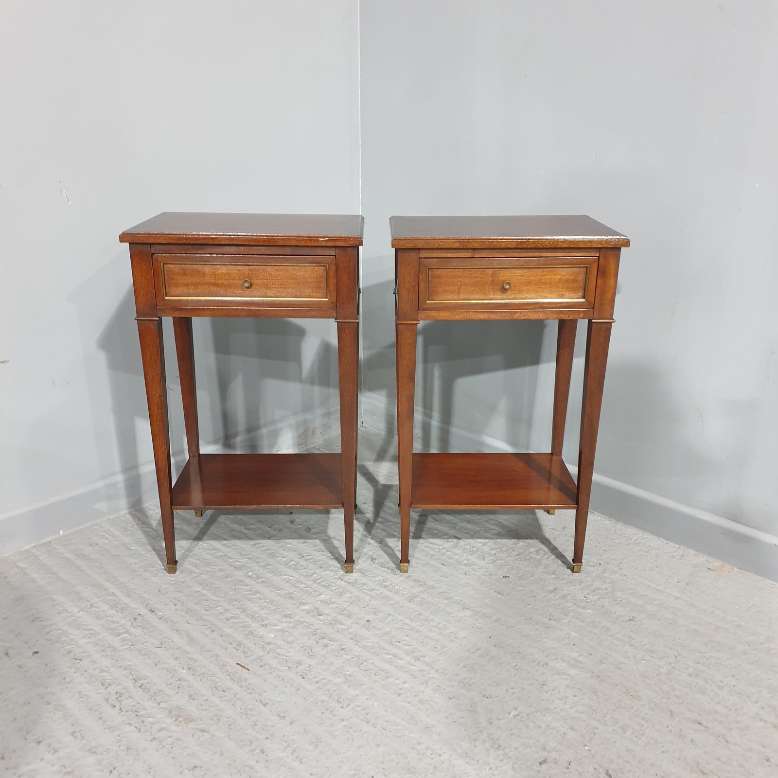 A very nice pair of French Empire style brass inlaid bedside lamp tables, with a single drawer and under shelf.